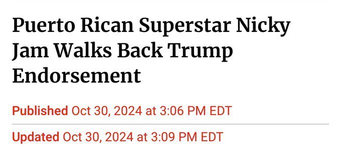 October 30, 20241 yr 8 hours ago, Mike31mt said: Ohh ok. Well my feed is filled with Americans who don't like being called garbage because they don't support a fake propaganda candidate with horrible ideas and no record of any accomplishments whatsoever. https://www.nbcnews.com/politics/politics-news/nicky-jam-walks-back-trump-endorsement-puerto-rico-garbage-comment-rcna178115 All I'm telling you is that this is an actual thing. It's got legs.