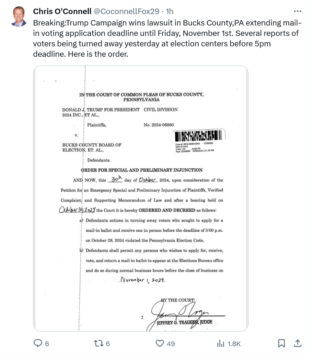 October 30, 20241 yr 9 minutes ago, lynched1 said: You'd have thought Shapiro would have gotten that under control yes, in response to Democratic cheating, a Bucks judge granted the petition for injunction