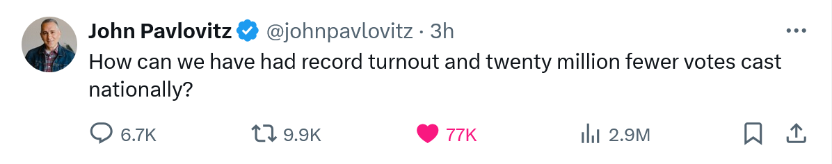 November 6, 20241 yr For those question why I thought there was monkey business in 2020, here are some numbers. I haven't double checked, but assuming they're accurate, it points to shenanigans in the 2020 election.