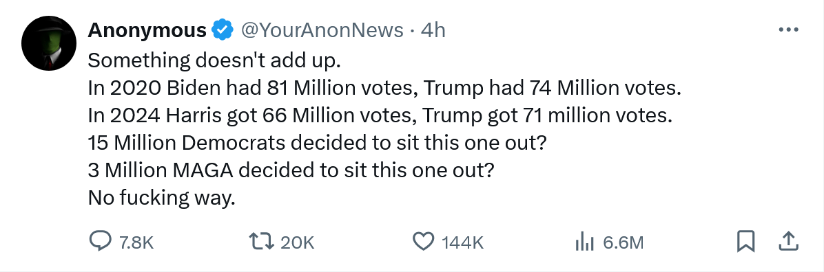 November 6, 20241 yr 23 minutes ago, Procus said: For those question why I thought there was monkey business in 2020, here are some numbers. I haven't double checked, but assuming they're accurate, it points to shenanigans in the 2020 election. Only speaking to the last two points why is the assumption Dems and Magas sat out. Maybe some of them did sit out or vote third party. Maybe some of them switched sides this time around. Lastly, maybe less people were energized this time around.