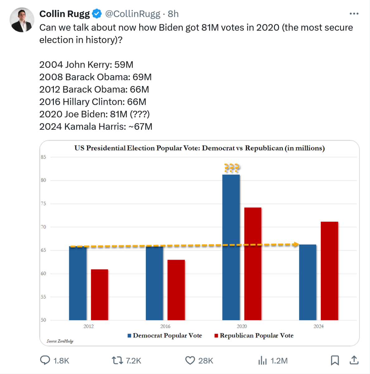November 7, 20241 yr 2 hours ago, Procus said: You keep posting this as if its some smoking gun but where do you think the steal was in 2020? PA, MI, WI, GA? Total votes in PA across the two candidates is less than 20k lower than 2020 (final votes still being counted), MI is actually 60k higher for 2024 than it was in 2022 and same in GA by about 200k. There has clearly been people who switched to Trump but in terms of Total vote, at least most of the gap is solely because votes are still being counted. Both her and Trump will go up significantly. Total votes in Cali alone for 2024 are only at about 9.5m but in 2024 it was 17.1m so 8m+ votes still to come in. Still a lot of votes to come in from the Western States (WA, OR, AZ, UT etc). When its all said and done, they will both end up in the 75m - 80m range.