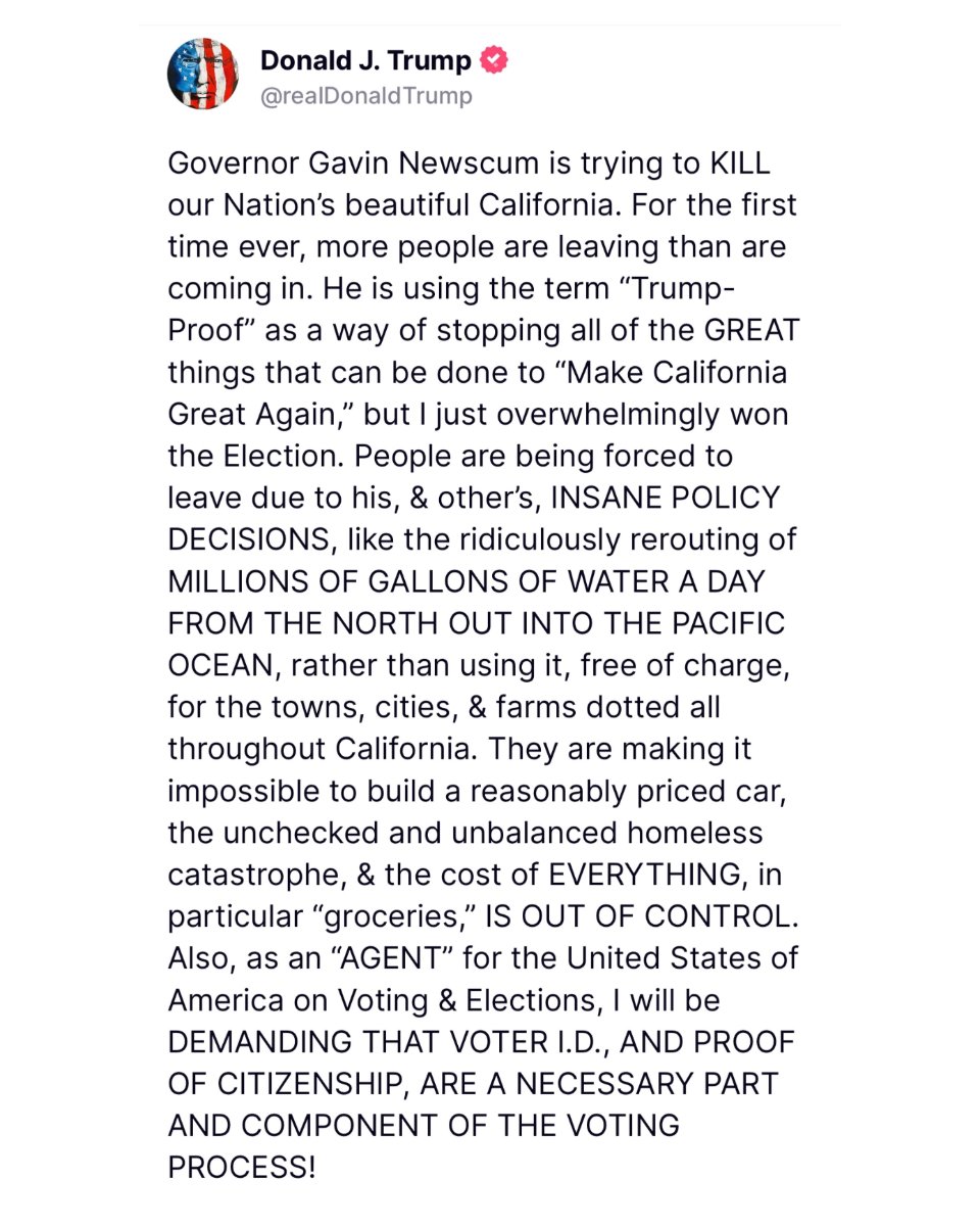 November 10, 20241 yr Northern California, which does not experience droughts, was releasing water from its reservoirs to a delta specifically to try and preserve an endangered species. This has been happening for over 20 years, long predating Newsom. Furthermore under Newsom it's being eliminated this year as studies have indicated it is not having the hypothesized effect. So Newsom actually is rolling back a policy that was shown to be ineffective by science. https://mavensnotebook.com/2024/10/01/press-release-state-water-contractors-applaud-californias-use-of-adaptive-management-in-the-bay-delta-for-2024/ California has similar voting requirements as Pennsylvania. To register you must provide identification. So voter ID already is part of the voting process. As far as California regulations go on vehicles, California has long been the state that pushes vehicles to be more efficient and environmentally sound. If voters don't like it they can come in Republicans.