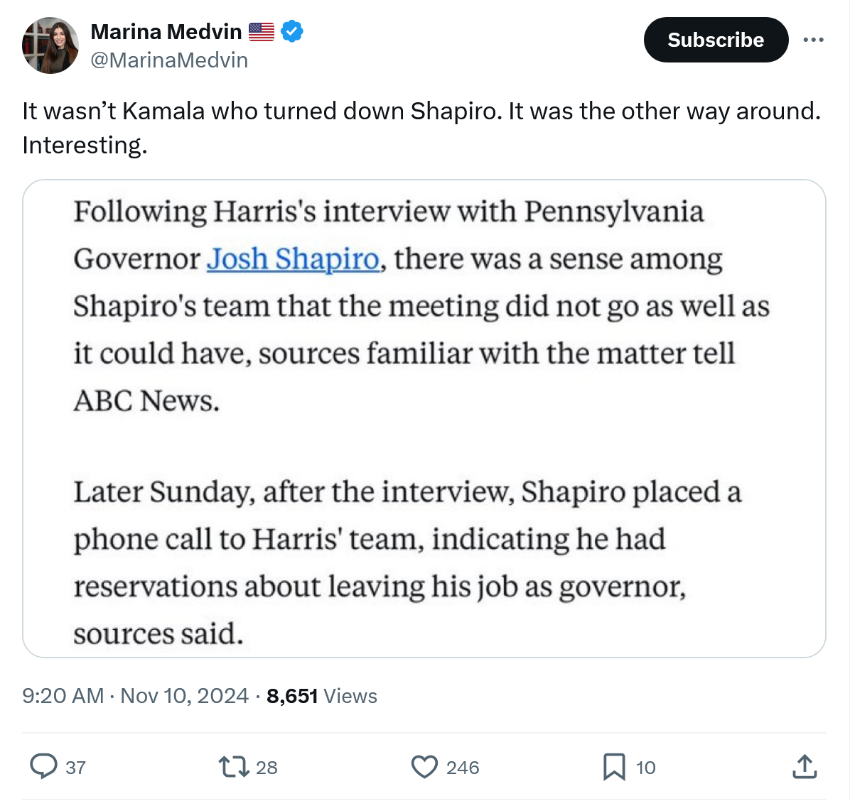 November 10, 20241 yr FWIW, if discrepancies like this happened in Harris's favor you'd have an apoplectic MAGA world descending on the State Capitols and dozens of court cases filed (and ultimately tossed for lack of evidence). The only explanation is tens of thousands of voters showing up, voting Trump, and walking out on any other elections.