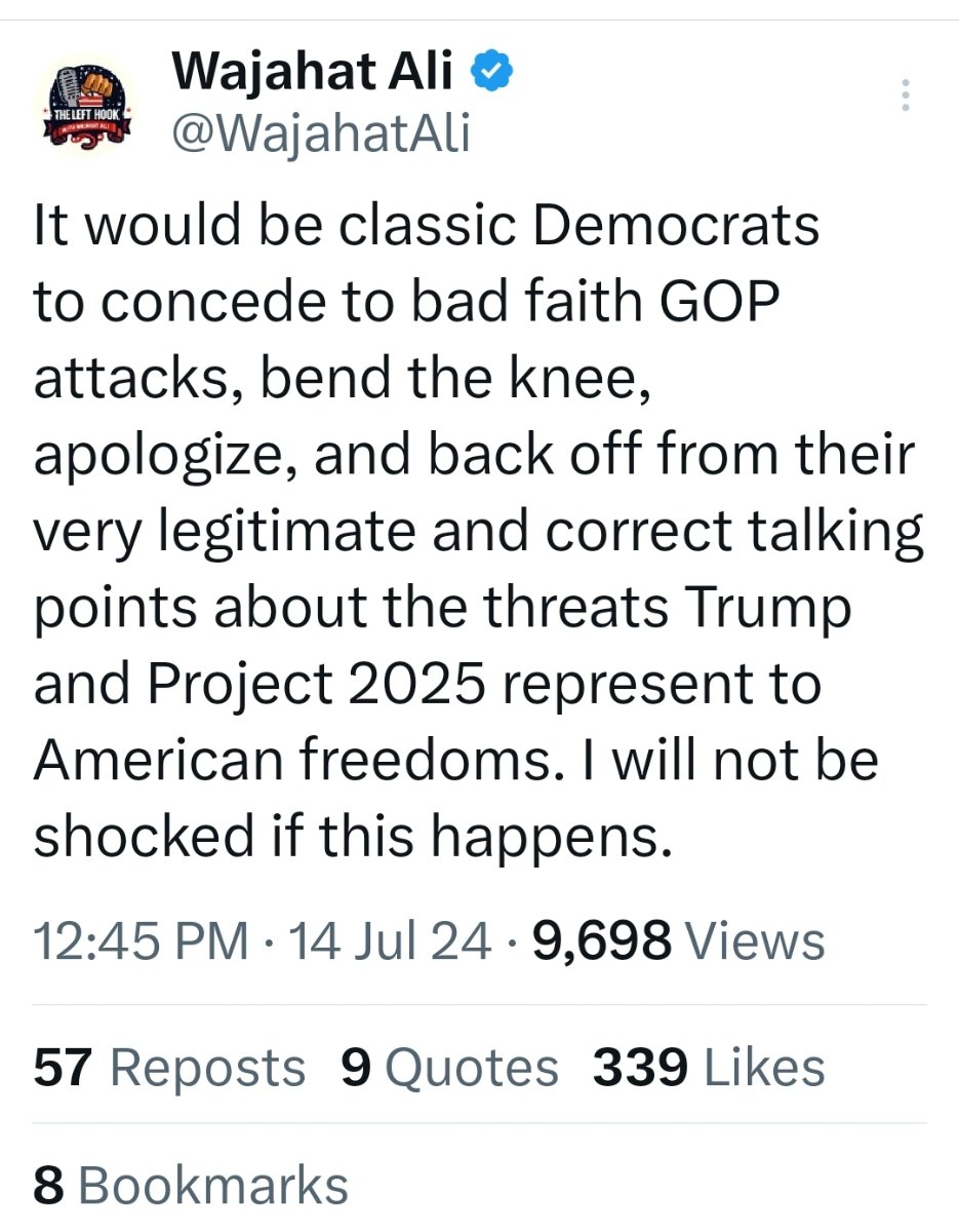 July 15, 20241 yr Bad couple of weeks for the Democrats. Biden bumbling in the debate, the country waking up to the fact that he has dementia and is not fit to serve, internal discord in the Democratic party with Obama working to oust Biden, Biden fighting back and not giving in. Now, the Trump assassination attempt with Trump's badass response. A long way to November, but still . .