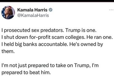 July 21, 20241 yr Just now, Gannan said: That wasn’t the takeaway I saw there. She looked like a Putin stooge saying we shouldn’t punish criminals She didn't say that. She was playing to the black vote, that Harris contributed to the unjust criminal system that black and other people of color protest against. Tulsi claimed Harris went for the more extreme sentences than needed, prosecuted harsh sentences for weed, and claimed she withheld evidence. Not that "we shouldn't punish criminals." I've seen many black people over the years complain about Harris' record as a prosecutor as well. It won't matter now, as she already marketed herself well as the prosecutor and Trump is the prosecuted. Trump is a convicted felon, which alone is absurd he can be on a ballot. Her record as a prosecutor is easy to spin or explain and quickly deflect back on to current issues. A simple rebuttal to her prosecution record is that she enforces the law, Trump breaks it. She upholds the Constitution, Trump incited Jan 6, etc. etc. What she has to do now is build a case for what she's done. The average voter doesn't know anything she's actually done. People that don't follow the news might see clips of her dancing, talking about her favorite rapper or remember the "I was speaking" line in the last VP debate. She gets criticism for being assigned to address the border crisis and doing nothing. They have to build her talking points of achievements and focus on what she'll do, and of course contrast to Trump.