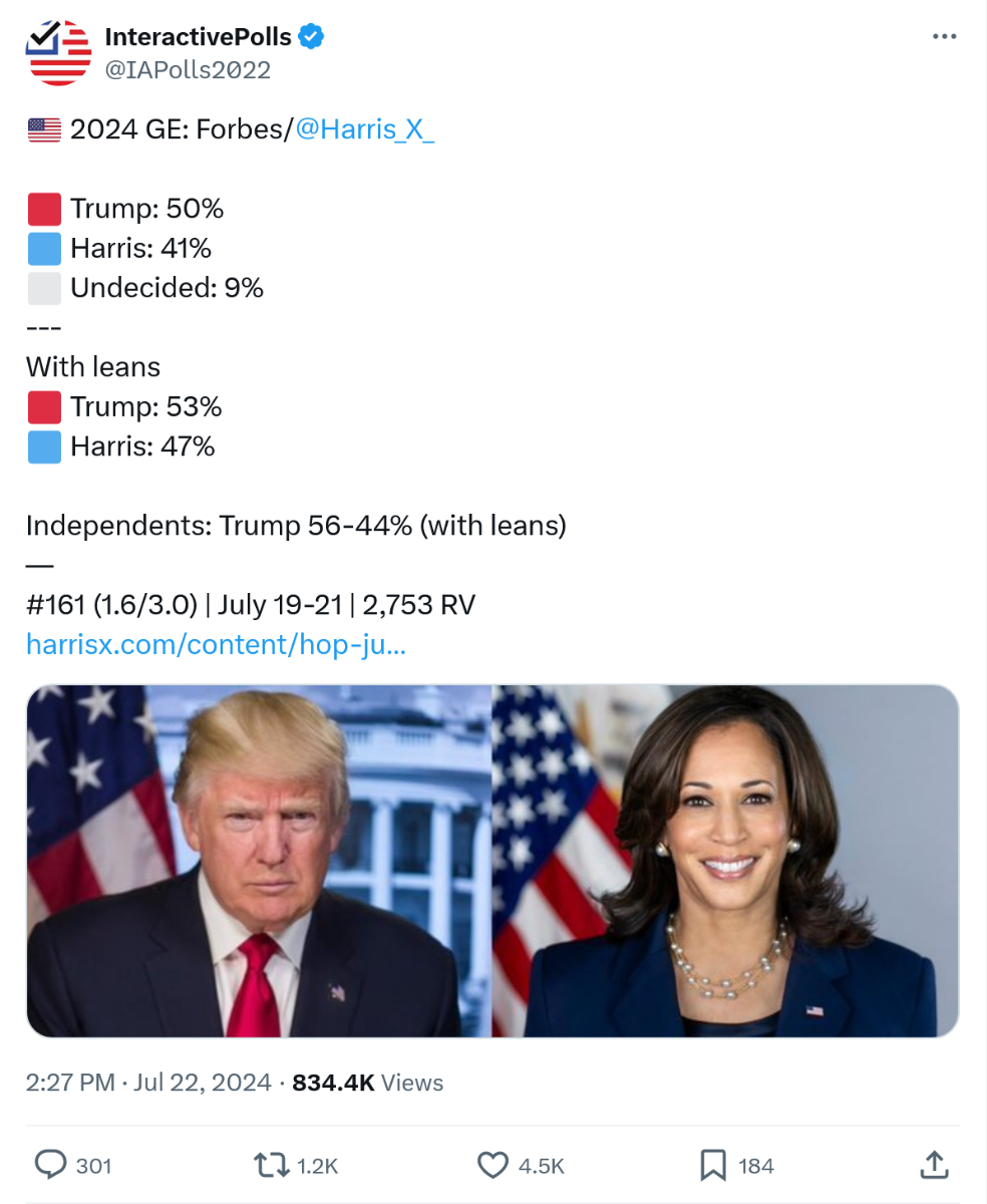 July 24, 20241 yr 5 hours ago, Dave Moss said: Fair, but why does the opponent matter? They thought the election was in the bag and it didn’t matter. That is no longer the case with Biden out.