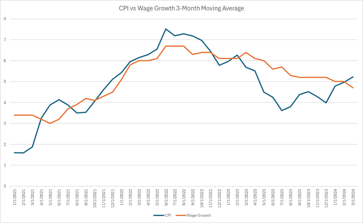 July 25, 20241 yr 2 minutes ago, JohnSnowsHair said: Sure, we're still in a slowdown phase of inflationary pressure. And nobody talks about the fact that inflation has also pushed wages up. Here's a chart of the 3-month moving average of inflation vs wage growth: sources: https://www.atlantafed.org/chcs/wage-growth-tracker https://fred.stlouisfed.org/series/STICKCPIM679SFRBATL Still waiting on my salary to be pushed up