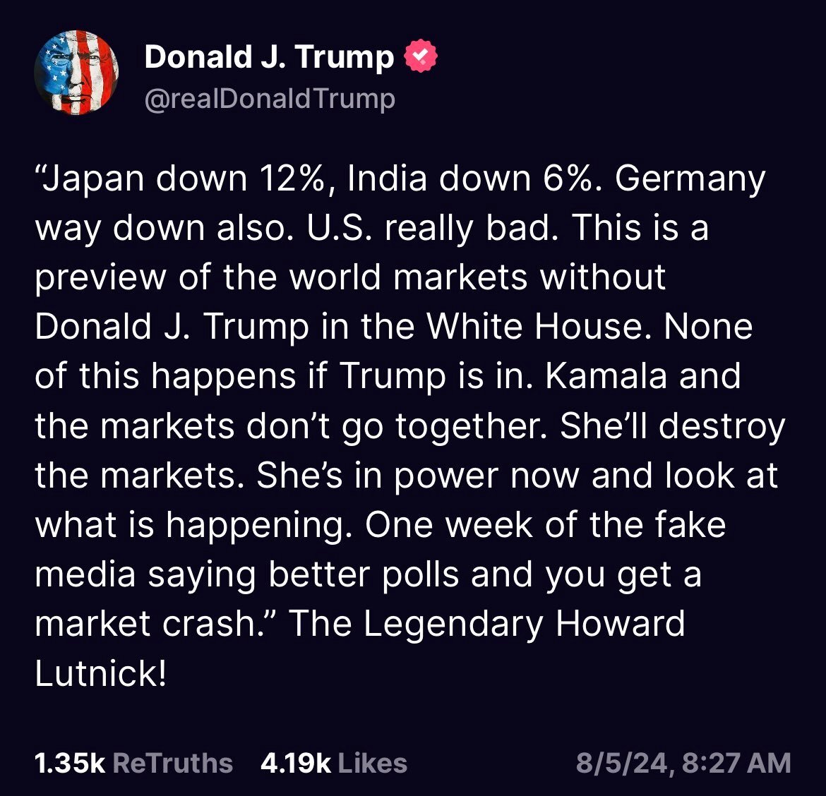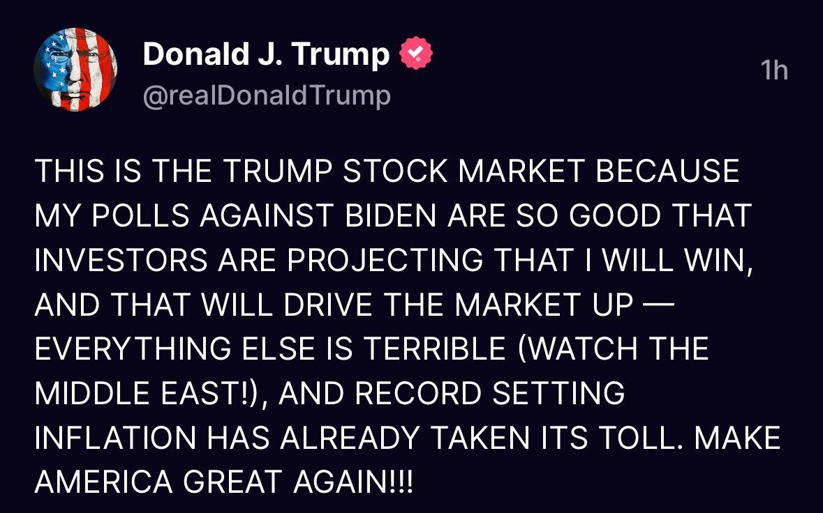 August 5, 20241 yr Quite the conundrum, to make the case it's " Kamala's stock market" he has to admit he's losing now.
