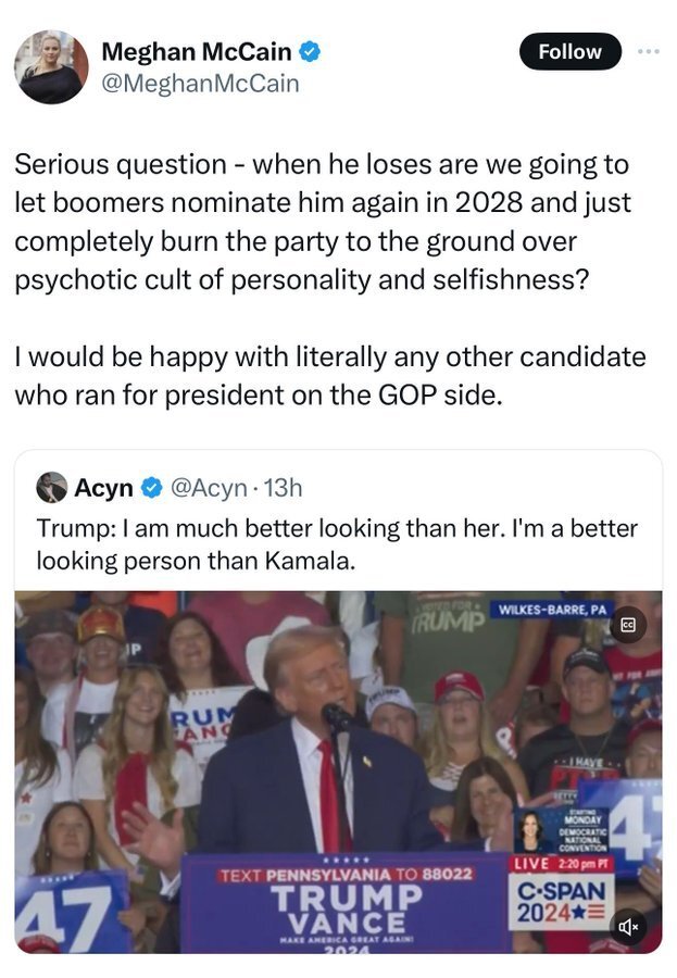 August 18, 20241 yr 1 hour ago, HazletonEagle said: I'm not sure he will win the primaries next time. I think people are tiring of his act and will vote for someone younger. He didn’t even participate in any of the debates and he won the primaries going away. As long as he is on the ballot, he will win the primary.