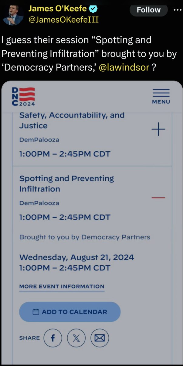 August 21, 20241 yr 41 minutes ago, lynched1 said: O’Keefe Media Group went undercover at the DNC convention in Chicago this week. I'm sure we'll have some entertainment from him in the near future about this