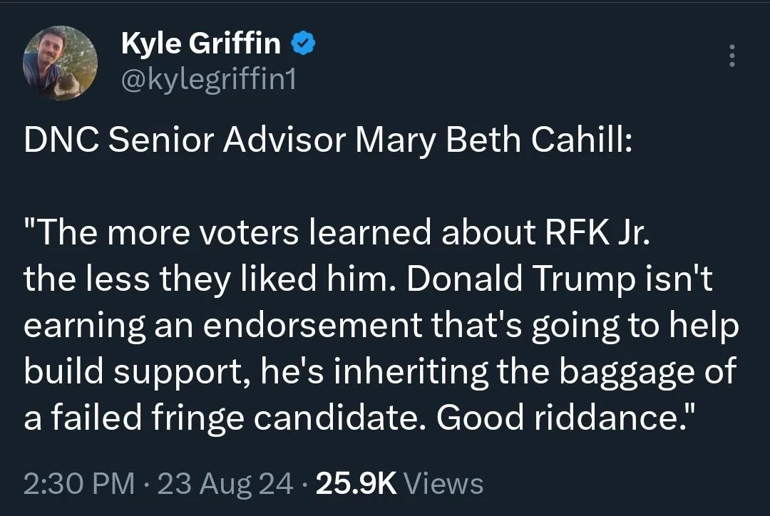 August 23, 20241 yr 3 minutes ago, Paul852 said: Imagine boasting about RFK Jr being on your side This is flooding my socials now, so forgive all the Tweets, but this sums it up pretty well...
