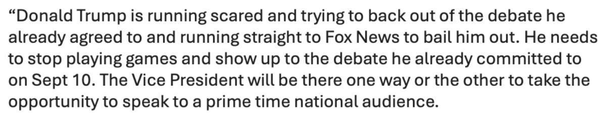 August 26, 20241 yr 8 minutes ago, VanHammersly said: Word is the sticking point for the ABC debate is the hot mic thing. Harris's team wants the mics hot, Trump's team wants them muted. Which is weird since it was the exact opposite before the first debate. But Trump's people realized the less he talks, the better he comes across. Smart of Harris to try and change it back. Seems like Trump's ego will eventually cause him cave on this one. He thinks the more he talks, the more people love him even though it's the opposite. Trump didn't want the bipartisan Commission to Presidential Debates to moderate the debate format. Instead he wanted to negotiate directly with the networks. Now he wants to drop out because he doesn't like the rules. This is what he gets. @The_Omega