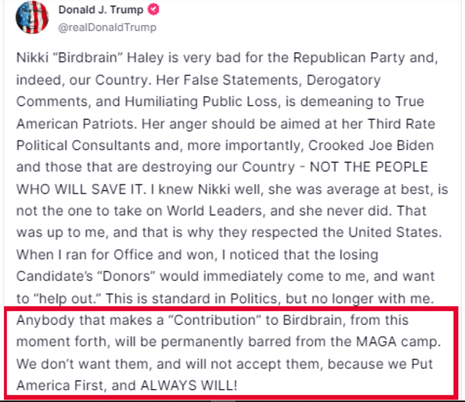 January 25, 20241 yr Trump threatens to blacklist Nikki Haley's donors https://news.yahoo.com/trump-threatens-blacklist-haley-donors-065211733.html Quote Trump wrote on Truth Social that anyone who makes a contribution to the Haley campaign "from this moment forth, will be permanently barred from the MAGA camp." "We don't want them, and will not accept them," he added. Trump's post did not specify whether he was referring only to donations to Haley's campaign or whether the warning extended to any donations given to a pro-Haley political action committee. Yes please, continue to alienate the few that might still vote for your incontinent orange behind.