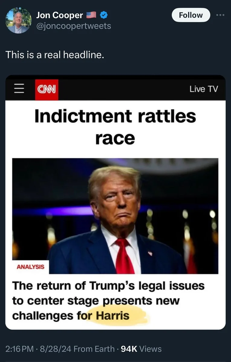 August 29, 20241 yr 6 minutes ago, Boogyman said: Look at them, trying to take the moral high ground when the guy they are voting for was paying porn stars for sex while his wife was pregnant lmao. I can't point out their lack of self awareness enough. Yeah, the infidelity angle was never going to work. Maybe don't tie yourself to a scumbag and things will start to stick.