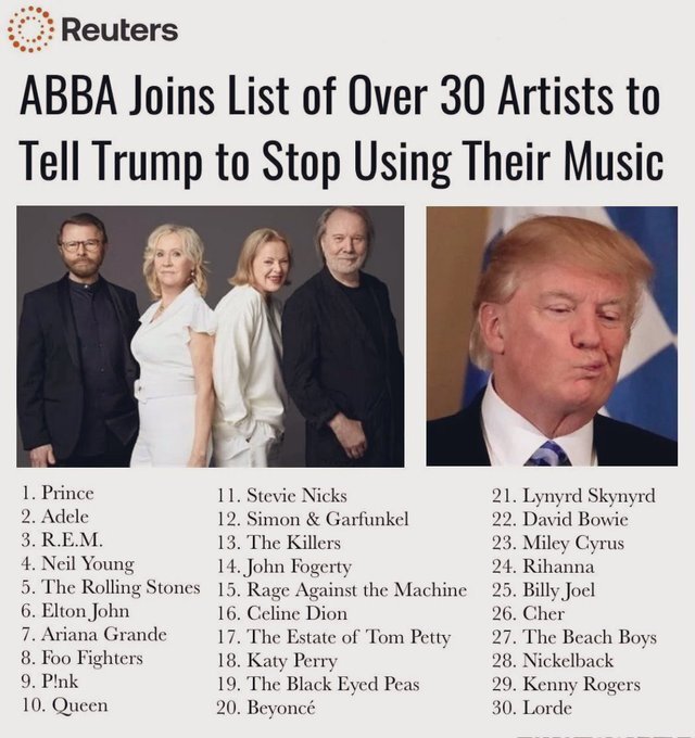 August 29, 20241 yr 19 minutes ago, Alphagrand said: Some of these artists are dead; maybe he can get some photo op shots at their graves with a thumbs-up sign If they signed away the rights to their catalogs for cash there isn't anything to do but protest. ABBA.........🤣🤣🤣