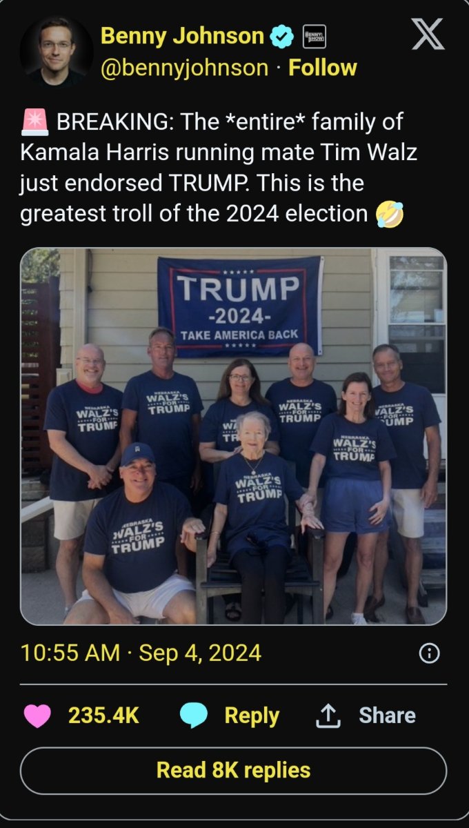 September 5, 20241 yr 11 hours ago, lynched1 said: There's a joke in there somewhere.......😆 Walz for Trump 2024