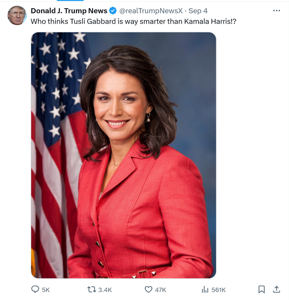 September 6, 20241 yr 12 hours ago, Procus said: Tulsi Gabbard ran on a platform of medicare for all and taking your guns. Watching you morons drool over her will never not be funny.