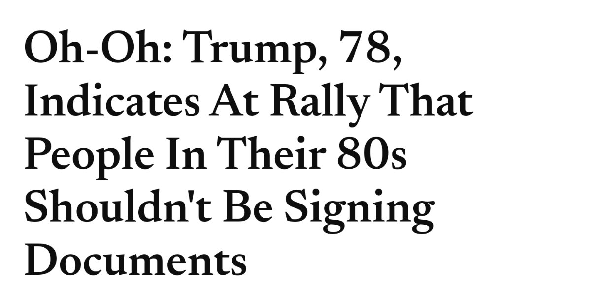 September 9, 20241 yr Oh-Oh: Trump, 78, Indicates At Rally That People In Their 80s Shouldn't Be Signing Documents Former President Donald Trump, 78, indicated at a Wisconsin campaign rally Saturday that "people in their 80s" are too frail to competently sign documents.