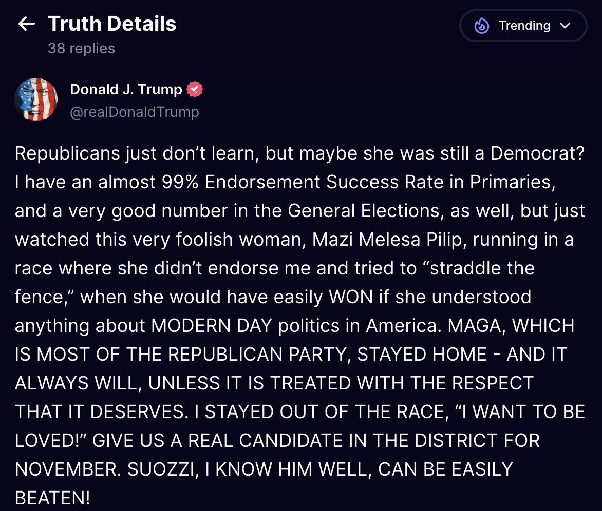 February 14, 20241 yr Quote "Republicans just don't learn, but maybe she was still a Democrat? I have an almost 99% Endorsement Success Rate in Primaries, and a very good number in the General Elections, as well, but just watched this very foolish woman, Mazi Melesa Pilip, running in a race where she didn't endorse me and tried to 'straddle the fence,' when she would have easily WON if she understood anything about MODERN DAY politics in America," Trump wrote. "MAGA, WHICH IS MOST OF THE REPUBLICAN PARTY, STAYED HOME - AND IT ALWAYS WILL, UNLESS IT IS TREATED WITH THE RESPECT THAT IT DESERVES. I STAYED OUT OF THE RACE, 'I WANT TO BE LOVED!' GIVE US A REAL CANDIDATE IN THE DISTRICT FOR NOVEMBER. SUOZZI, I KNOW HIM WELL, CAN BE EASILY BEATEN!"