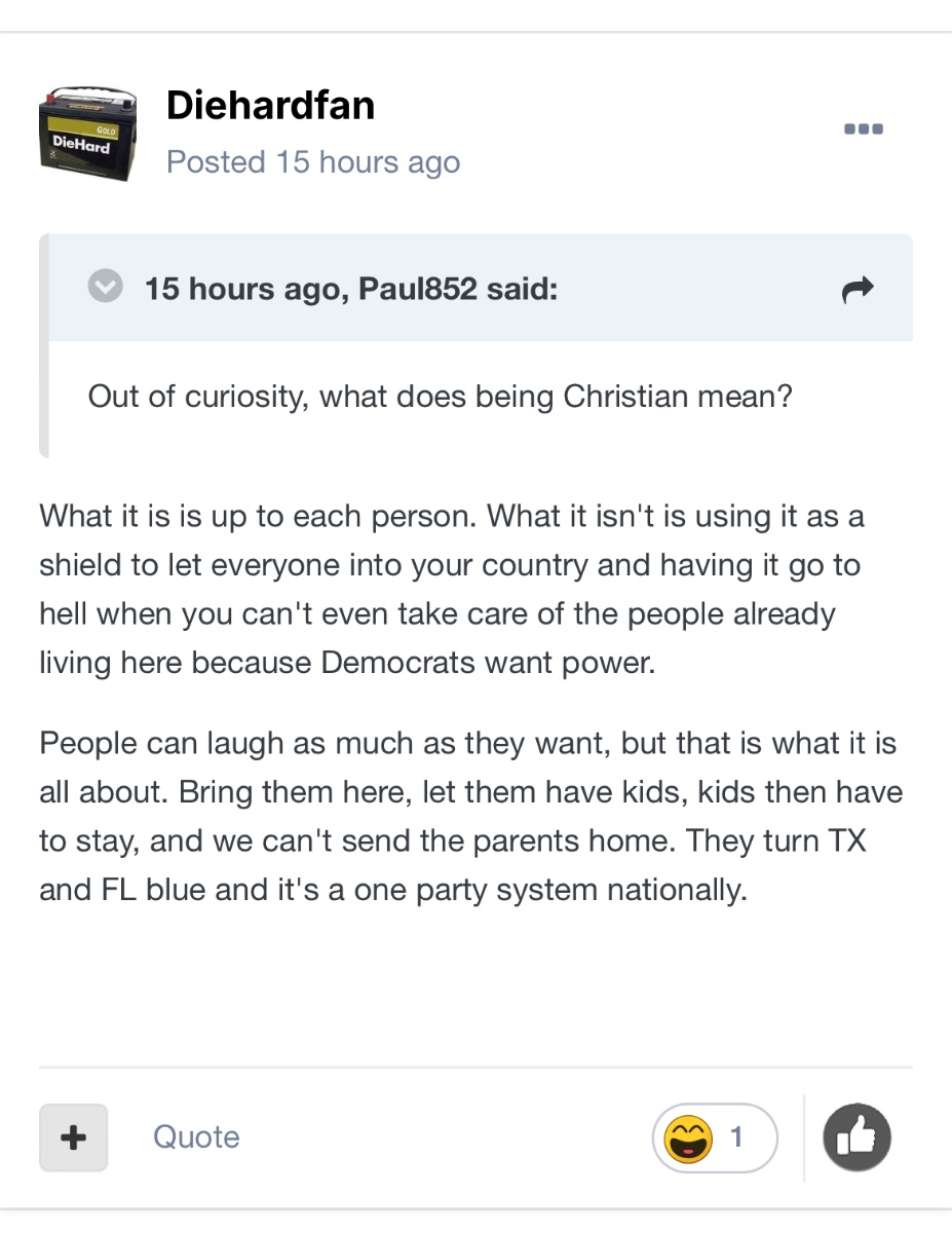 September 10, 20241 yr 17 minutes ago, MidMoFo said: What does it mean to be a Christian? Diehardfan: What it is, is up to each person. Midmofo reading the thread hours later and scratching his head: Nope. He is completely making that up and doesn’t know that basics of Christianity. Reading comprehension didn't work for you, huh? It's not up to me to tell people what it means to be a Christian. That doesn't mean do what you want.