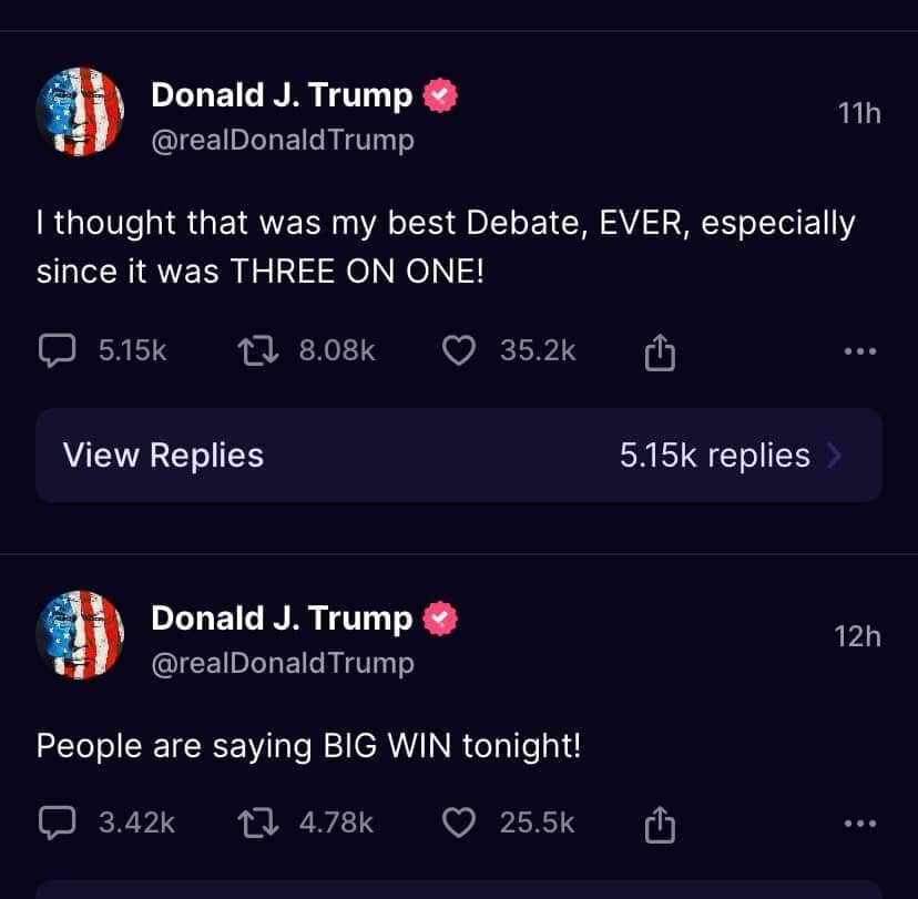 September 11, 20241 yr Won so bigly I demand ABC be shut down! Trump Demands ABC Be Shut Down for Daring to Fact Check Debate The former president called into Fox & Friendson Wednesday morning to complain that he’d faced a "rigged deal” with the debate, with moderators "correcting everything” he said while "not correcting with her.” Asked why he felt moderators hadn’t corrected Harris in the same way, Trump answered: "Because they’re dishonest.” "I think ABC took a big hit last night,” he continued. "To be honest, they’re a news organization—they have to be licensed to do it. They ought to take away their license for the way they did that.”