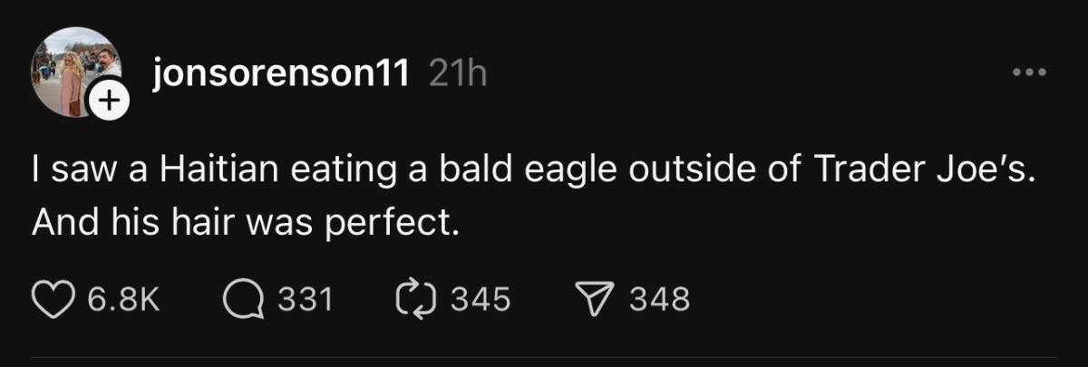 September 11, 20241 yr Just now, BDawk_ASamuel said: You guys are the ones who keep bringing out the geese issue. I also mentioned that the citizens of that community have brought up other issues like reckless driving but you seem unbothered by it and only want to talk about geese. Why are X amount of migrants being unloaded into a small town that clearly doesn’t have the funding or resources to handle them? It’s not fair to neither the migrants nor the people of that community. And this isn’t the only town where it is happening. donald cheeto trump brought up immigrants eating pets during a f'n presidential debate. there are no legitimate reports of immigrants stealing people's pets & eating them. that's why we're all talking about it.
