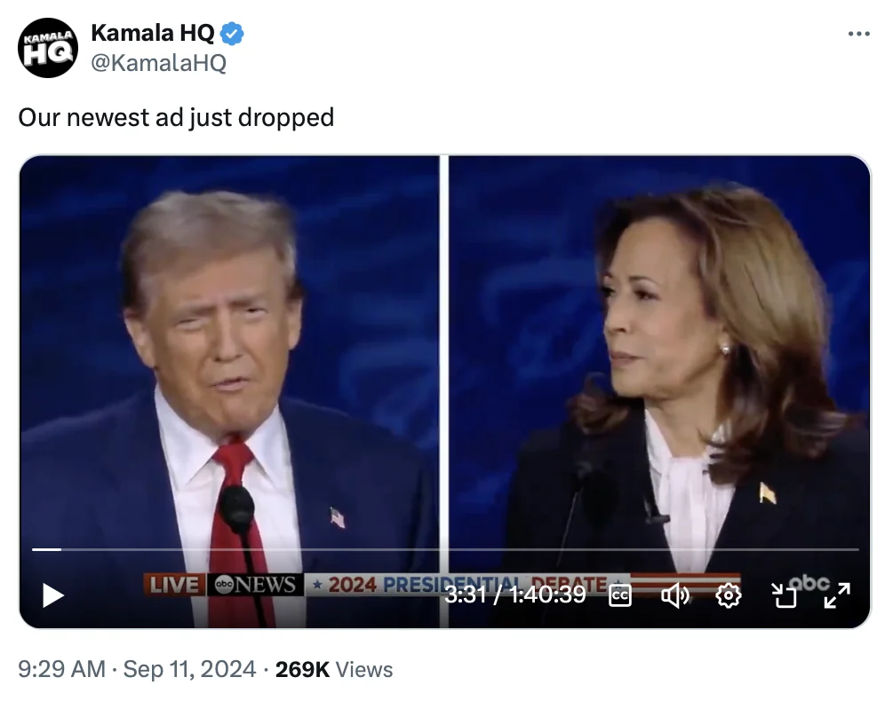 September 11, 20241 yr Okay, I gotta stop with all the screenshots. But sharing a full 100-minute debate as "our newest ad just dropped" is Fn cold.