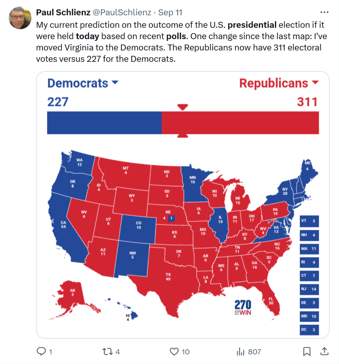 September 14, 20241 yr 8 minutes ago, Procus said: Paul Schlienz predicts landslide Trump victory Wait, recent polling led him to just NOW change Virginia to Dems? It was 324-214 before?