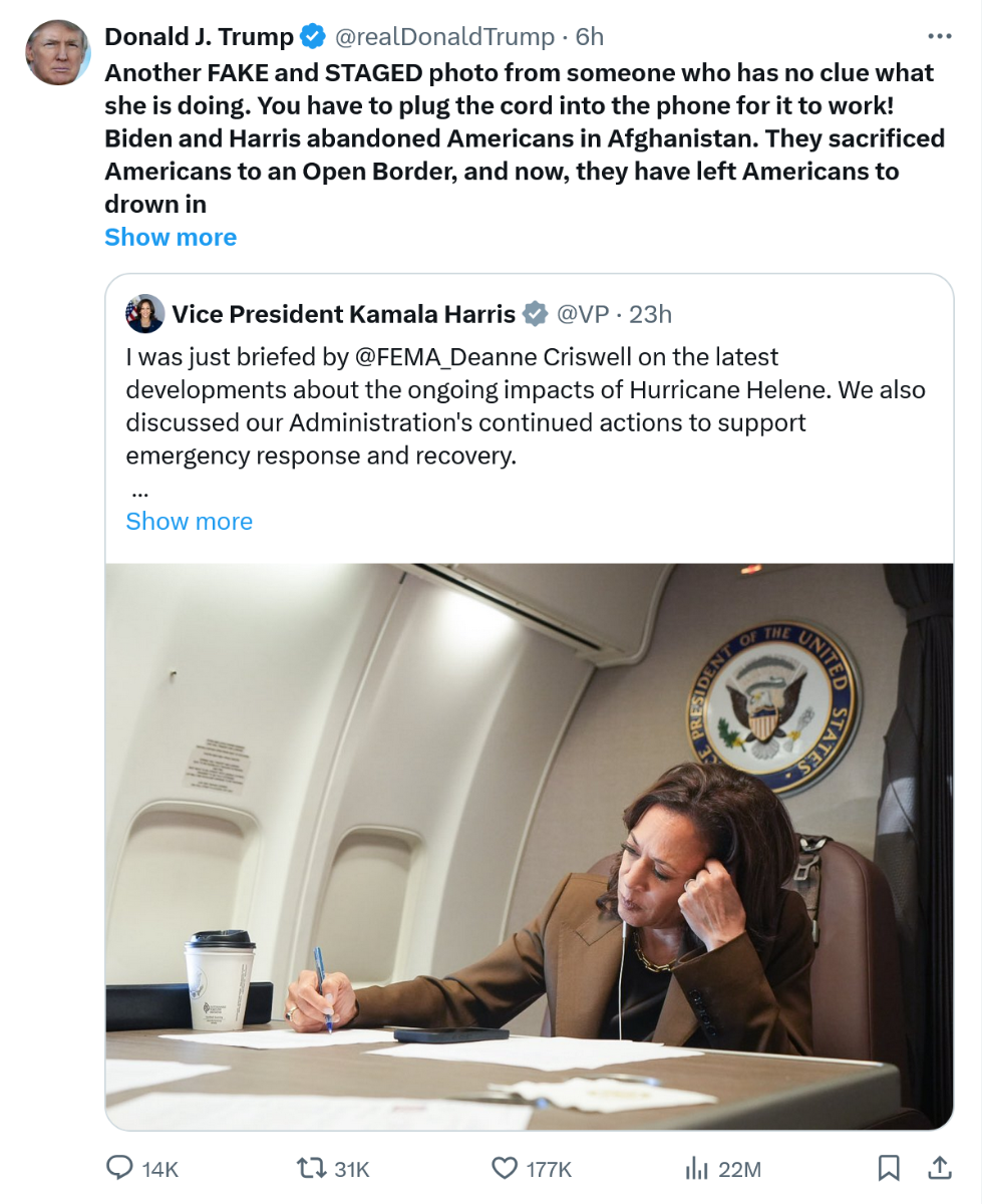 October 1, 20241 yr Here’s what Georgia Gov. Brian Kemp had to say about Biden and the feds: "The president just called me yesterday afternoon. I missed him and called him right back and he just said, ‘Hey, what do you need?’ And I told him, ‘We got what we need. We’ll work through the federal process. He offered that if there’s other things we need just to call him directly, which I appreciate that,” Kemp said. "We’ve had FEMA embedded with us since a day or two before the storm hit in our state operating center in Atlanta. We’ve got a great relationship with them,” he said. https://www.nj.com/politics/2024/09/georgians-get-fast-hurricane-aid-from-biden-and-harris-and-its-driving-trump-crazy.html