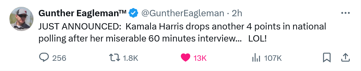 October 8, 20241 yr All of the initial reaction is Kamala's 60 Minutes interview was great. Even CNN is doveish.