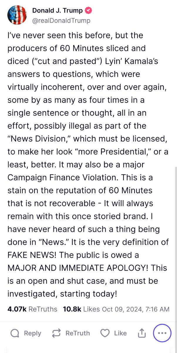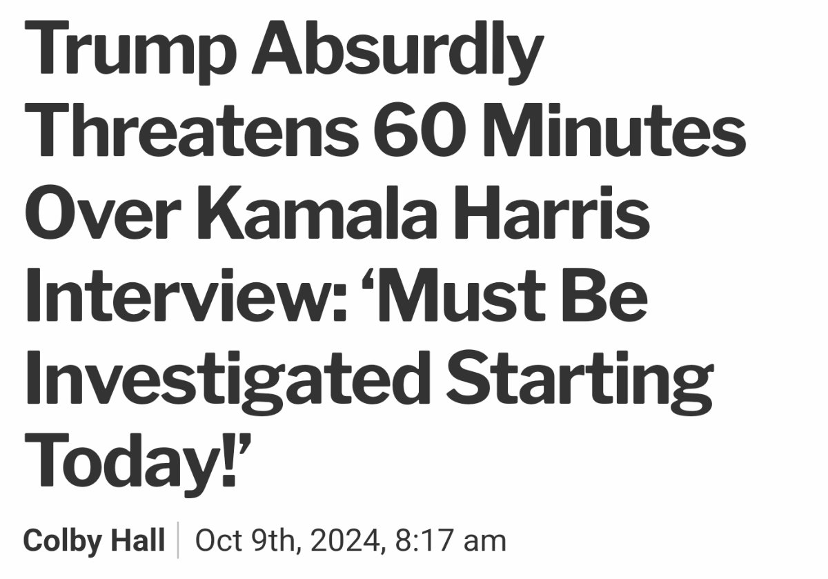 October 9, 20241 yr That's curious. Why would Trump say it was a rigged interview if she did supposedly so poorly? I'm sure all the trumpbots will offer up a perfectly good explanation for this paradox too.