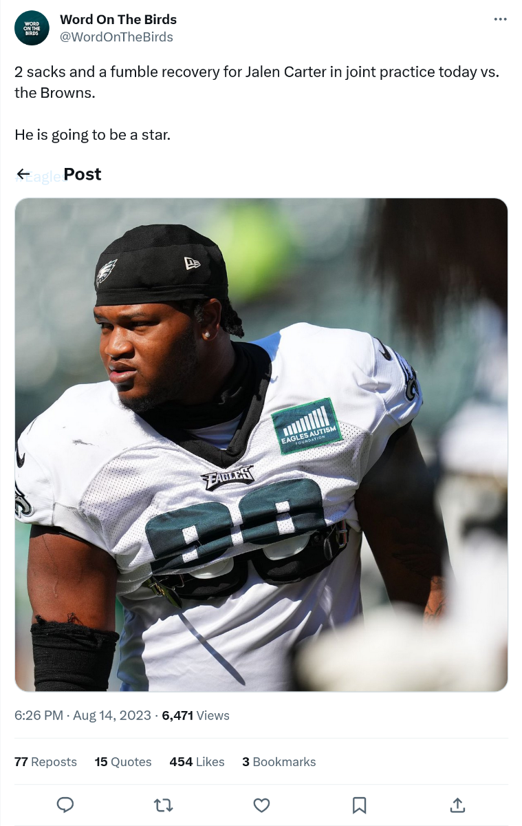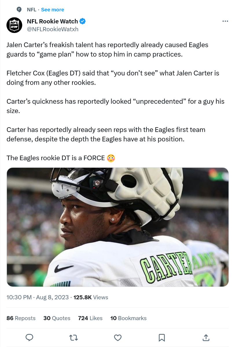 September 26, 20232 yr CJ Stroud is already showing signs of being a legit NFL QB but the Texans had another shot at #3. All 7 teams and the rest of the league who could have traded up were fools to let Carter fall to Philly. He's looking like the next Randy Moss or Warren Sapp as can't miss players who a bunch of randomly applied moral concerns weirdos decided they did not want.