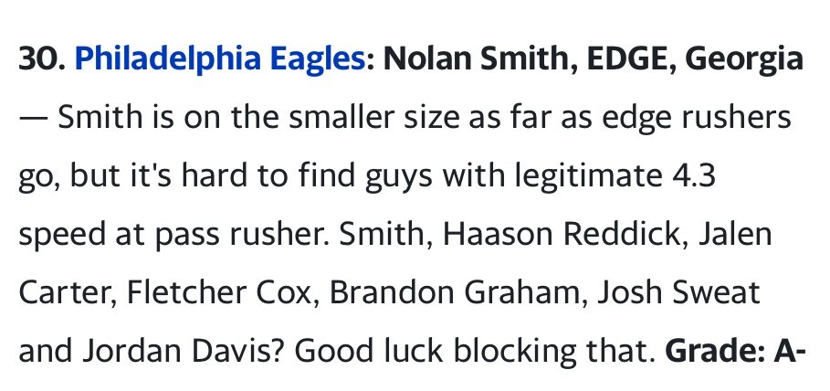 April 28, 20232 yr I would've been happy with him at 10. Getting him at 30 is almost surreal especially after already nabbing Carter at 9. I can't say any NFL team had a better draft so far than the Eagles.