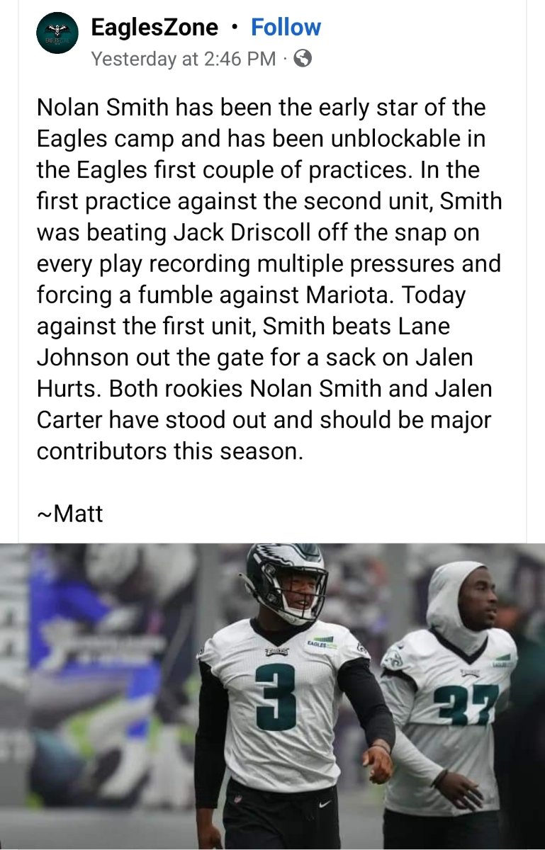 July 29, 20232 yr "-Rookie first-round pick Nolan Smith had an impressive session and was able to show off his unique skill set because of Reddick’s absence. Mainly playing as an overhang player coming off the left side, Smith showed his ability to generate pressure on one play and quickly followed that with solid coverage skills against Dallas Godert and Boston Scott.” https://www.si.com/nfl/eagles/news/philadelphia-eagles-training-camp-takeaways-nolan-smith-aj-brown-jalen-hurts-nick-sirianni When Smith really starts to understand the NFL he’s going to be a heck of a player for the Eagles.