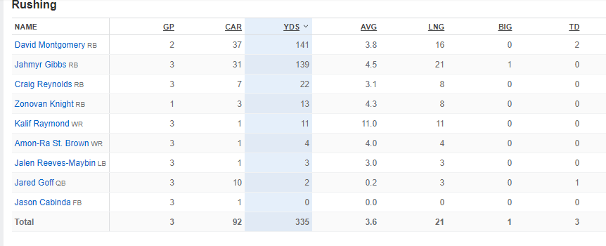 September 26, 20232 yr 25 minutes ago, Bwestbrook36 said: They signed David Montgomery too Montgomery and Gibbs combined are still less than Swift. Swift also didn't even have any carries in game 1 this is from just 2 games.