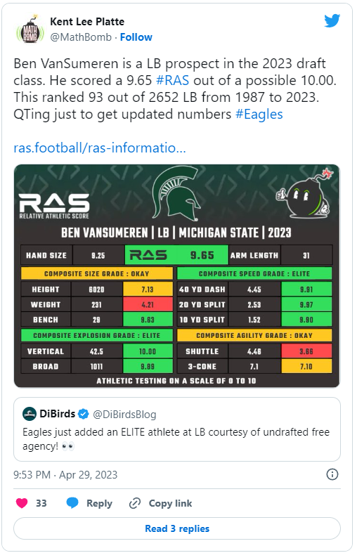 Posted May 2, 20232 yr Some UDFA Talk Posted: April 30th, 2023 | Author: Tommy Lawlor The Eagles won’t officially release the list of UDFA additions for a day or two. We’ll talk about a few of the big names they have reportedly signed. LB Ben VanSumeren – Michigan State – 6-2, 231 Interesting player. Had an incredible showing at his Pro Day. So how does a guy with solid size and special athletic ability go undrafted? Went to Michigan as a RB/FB. After two years, moved to LB. Then he transferred to MSU in 2021. He was a backup LB and STer. Finally became a starting LB in 2022. Started 10 games and played well. Finished third on the team with 81 tackles. Limited playmaker, though. Had 3 TFLs, 2 sacks and 2 PDs. No FF or INTs. Put on the tape and you see VanSumeren’s athleticism. He can fly from sideline to sideline. He has excellent agility and movement skills. The problem is that he’s not a natural LB. He’s still learning to diagnose plays and read offenses. He doesn’t finish plays as well as you’d like. He closes to the ball in a hurry, but is a sloppy tackler. We hear Howie Roseman talk about finding players with "tools in their body”. That is absolutely VanSumeren. He’s got the raw ability to be a starting LB in the NFL. He needs work, though. I think he’s got a legit chance to win a roster spot because of his potential, but I don’t think he’d be ready to play this year. Maybe good coaching will make a huge difference and I’ll be shocked in the preseason, but I see a guy who will likely need time to develop. WR Joseph Ngata – Clemson – 6-3, 217 Finished his career 88-1287-6. Best season was 2022 when he caught 41 passes. The Clemson offense struggled with throwing the ball in the past two seasons so that didn’t help matters. The Eagles reportedly gave Ngata big money to sign so this is a player they really wanted to get. He has good ability. Ran 4.54 and jumped 34.5 inches so that’s a good start for a WR. He doesn’t have good agility. Ngata is big and strong and plays that way. Can work the middle. Able to extend and pluck the ball. Will make some tough catches. I thought the Eagles would prefer a big receiver so adding Ngata makes sense. Can learn a lot by watching AJ Brown. Both are big, physical receivers. Ngata has legit ability. The question is whether he can consistently get open in the NFL. Ngata will block and knows how to use his size. Those traits give him a chance to win a spot in the NFL. WR Jadon Haselwood – Arkansas – 6-2, 215 Elite recruit coming out of HS, number four overall (Nolan Smith was one of the guys ahead of him). Went to Oklahoma, where he played with some QB named Jalen Hurts in 2019. Best year was 2021 when he went 39-399-6. Transferred to Arkansas and had a terrific season, going 59-702-3. Playing in a tough, physical offense seemed to bring out the best in him. Ran 4.66 at the Combine and then improved that to 4.55 at his Pro Day. Solid athlete overall. At his best in the slot. The Eagles use AJ Brown in there as a "big slot”. Haselwood doesn’t have anywhere close to his ability, but would be similar in terms of style. Has good RAC ability. Scrappy player who will block. Might remind you of Zach Pascal. Haselwood will compete. He’ll play on STs. He’s never going to be a star receiver, but this is the kind of UDFA you want. He’ll come in and battle for a spot. OL Trevor Reid – Louisville – 6-4, 311 2-year starter at LT for the Cardinals. Good athlete and put on a show at his Pro Day: 38-inch vertical, 10-4 broad jump, 4.90 40-yard dash, 25 reps. Went undrafted because he is a project. Has a lean build. Will likely need to add some bulk in the NFL. Quick off the ball, but plays out of control. Poor balance. Gets out over his feet way too much. Jeff Stoutland has his work cut out for him. Reid has the athleticism you want in an NFL OL. He just doesn’t have any polished skills. He’s light on his feet, but doesn’t have good footwork. Stoutland has to get him to slow down, play under control and use good technique. Reid is the kind of guy you want on the practice squad. http://igglesblitz.com/2023/04/some-udfa-talk/
