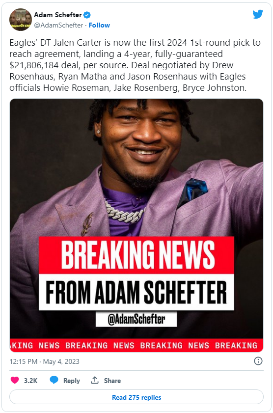 Posted May 5, 20232 yr Carter becomes first 2023 1st-round pick under contract The Eagles didn’t waste any time signing their top draft pick. In fact, Jalen Carter is the first 1st-round pick of the 2023 draft class to reach an agreement, ESPN’s Adam Schefter reported. This rookie contract is a standard four-year deal but all first-round pick contracts come with a fifth-year option. So the Eagles now have Carter under contract through 2026 with an option year in 2027. That option year for 2027 must be exercised during the 2026 offseason. According to OverTheCap, here are the expected cap figures for Carter during his rookie contract: 2023: $3.96 million 2024: $4.956 million 2025: $5.95 million 2026: $6.94 million OTC estimates the Eagles’ rookie pool for 2023 is just over $11 million and the Eagles will need about $5.8 million in cap space for it. Getting deals done with rookies has been much easier over the last decade-plus since the 2011 CBA. The days of rookie holdouts are long gone thanks to the introduction of slotted contracts. Carter is one of seven draft picks in the Eagles’ 2023 class. He and fellow Georgia Bulldog Nolan Smith, who was taken at No. 30 overall, are their two first-rounders this year. Carter, 22, is a really talented defensive tackle who was a star for the Bulldogs as they won back-to-back national championships. While he was taken at No. 9 overall, some thought he was the best player in this entire class. He likely dropped because of concerns about his maturity, which the Eagles addressed on draft night. In Philadelphia, Carter will join a really talented defensive line that already includes Fletcher Cox, Haason Reddick, Josh Sweat, Jordan Davis, Brandon Graham, Milton Williams and more. The Eagles are holding their rookie camp this weekend for draft picks, undrafted signings and tryout players. The veterans will join the rookies on May 30 for the start of OTAs. https://www.nbcsports.com/philadelphia/eagles/eagles-jalen-carter-becomes-first-2023-1st-rounder-under-contract