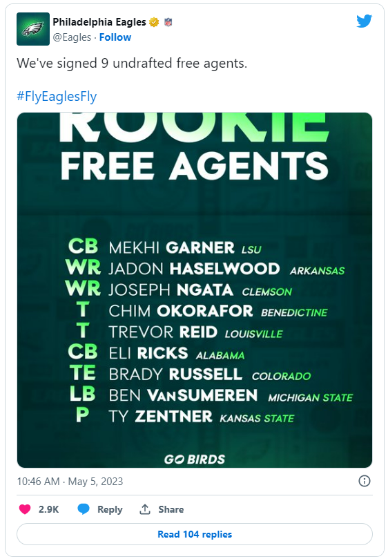 Posted May 7, 20232 yr Eagles rookie camp practice notes BY JIMMY KEMPSKI PhillyVoice Staff CHRIS KWIECINSKI/USA TODAY SPORTS We may never know if Jalen Carter did or didn't call Nick Sirianni before the draft, a mystery that will rival Stonehenge. On Friday, the Philadelphia Eagles' new crop of rookies hit the field for the first time at the NovaCare Complex. We were allowed to watch them warm up and go through some individual drills, so there wasn't much to see. Still, we'll comment on some stuff from our day of media availability, and our interviews with the rookies. • Rookie third-round offensive lineman Tyler Steen lined up at right guard. Steen exclusively played at tackle during his college career at Vanderbilt and Alabama, but the Eagles listed him as a guard when they drafted him. Nick Sirianni was asked during the weekend of the draft if Steen would have the opportunity to compete for the starting RG job that was vacated by Isaac Seumalo, who left in free agency. "That's really a long way away," he said. "We don't have to make that decision for a while, but the best player will play at that position, and we feel like we have some good options, and the reason why we took him is because we feel good about him. Everybody in the building feels good about him. Yeah, it's too early to say that, but the best player will play, so I guess that kind of answers that question."< The favorite to start at RG for the Eagles in 2023 is 2022 second-round pick Cam Jurgens, but it appears that the Eagles aren't just handing him that job. He'll have to earn it. • Steen happened to mention that he was one of the Eagles' 30 allotted pre-draft visits. The Eagles also had Jalen Carter, Nolan Smith, and Kelee Ringo in for pre-draft visits, in case there is any doubt that they're meaningful indicators of the Eagles' interest in prospects. • Earlier in the week, Adam Schefter of ESPN said during a radio hit on 97.5 that Jalen Carter called Nick Sirianni to express that he wanted to play for the Eagles. When asked about that phone call, Carter denied that it had happened. "I can't remember if I called anybody," he said. "Nah, I didn't call. I don't remember that." So that's a little weird. I'm not sure what to make of that, but just found it noteworthy. 🤷♂️ • The Eagles announced their undrafted free agency signings. In case you missed our analysis of all those guys, you can find that here. We did not have Chim Okorafor in our roundup. He is a 6'6, 315-pound offensive tackle with very limited athleticism (he ran a 5.46 40, for example). One other quick note on the UDFAs: I thought Garner might get a look at safety, but the Eagles listed him as a CB. • Again, we didn't get to see much of practice, but if I were to single out one under-the-radar rookie who looks the part, it's undrafted free agent WR Joseph Ngata. That dude is jacked. • Perusing the names of the tryout guys, there were two recognizable names: WR Charleston Rambo: 79-1172-7 in his final season of college at Miami in 2021. WR Austin Proehl: Proehl is the son of former NFL wide receiver Ricky Proehl. He was drafted by the Bills in 2018. Number analysis And finally, we got to see what numbers the newcomers will be wearing. We'll limit this to just the guys who got drafted or signed in free agency, and a few select UDFAs, with a thumbs up or thumbs down on the numbers they were assigned: Rookies • DT Jalen Carter (98): As expected. 👍 • Edge Nolan Smith (3): I like the aesthetic of Smith and Haason Reddick (7) both in single-digit numbers. 👍👍👍 • OL Tyler Steen (56): That's a center or a linebacker number, not a guard/tackle. Give that man something in the 60's or 70's. 👎 • S Sydney Brown (43): Maybe Brown is a Troy Polamalu fan? If so, I can respect that as a player to try to emulate. 👍 • CB Kelee Ringo (37): Yuck. 👎 • QB Tanner McKee (10): That's pretty much all that was left after the veterans gobbled up all the other numbers. 🤷♂️ • DT Moro Ojomo (72): Yes, perfect number for a seventh-round DT battling to make the team. Reminds me of Cedric Thornton. If the NFL were to add 00 as an eligible number down the road and Ojomo pans out, he should switch to that. 👍 Veterans • RB D'Andre Swift (0): Swift will be the first Eagle to wear No. 0. I like the fit. There will be pressure on Swift to perform to avoid "zero" jokes. 👍 • QB Marcus Mariota (8): Arryn Siposs is now 10, along with McKee. 👍 • WR Olamide Zaccheaus (13): Small slot receiver in 13? Yep. 👍 • RB Trey Sermon (22): Sermon moves from 34 to 22. That's a pretty good number for a guy who may not make the team. 👎 • RB Rashaad Penny (23): Yep. 👍 • S Terrell Edmunds (26): Yep. 👍 • S Justin Evans (30): Evans was 30 with the Saints. 👍 • CB Greedy Williams (38): Many of you objected to Williams being left off my "way too early 53-man roster projection." Williams getting the No. 38 justifies my thinking. 👍 • LB Nicholas Morrow (41): Oof. 👎 • P Ty Zentner (49): OMG the Eagles have a punter with the No. 49! Big for his brand, IMO. 👍 • WR Joseph Ngata (86): The Eagles didn't hold Zach Ertz's old number very long. Great player, fond memories, etc. etc., but he wanted out of here. I agree that his number shouldn't be held. 👍 • WR Jadon Haselwood (87): They held Brent Celek's number way too long, so it's good to see that back in circulation. 👍 • DT Kentavius Street (97): Street takes Javon Hargrave's old number. 👍 You're welcome for this valuable service. https://www.phillyvoice.com/eagles-rookie-camp-practice-notes-2023/