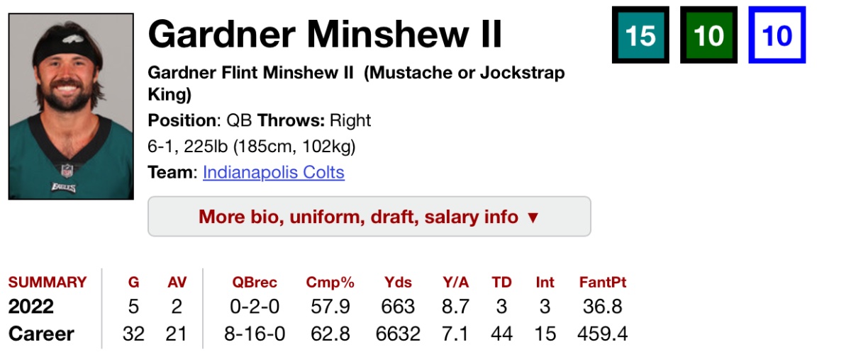 May 18, 20232 yr On 5/13/2023 at 5:15 PM, opa-opa said: If Minshew didnt suck last year he would have been great trade bait. Oh well. Maybe Gainwel? I would say right now he is someone who built up more value than his draft pos. Minshew left from the Eagles as a free agent so there was no way he would have been trade bait, but I have two questions. First is how did Minshew not suck last year? The second is what is this market you mentioned that Minshew had? I mean when he actually had good numbers with the Jags they only got a 6th for the guy. You really think teams would have given the Eagles better after he put up these numbers?