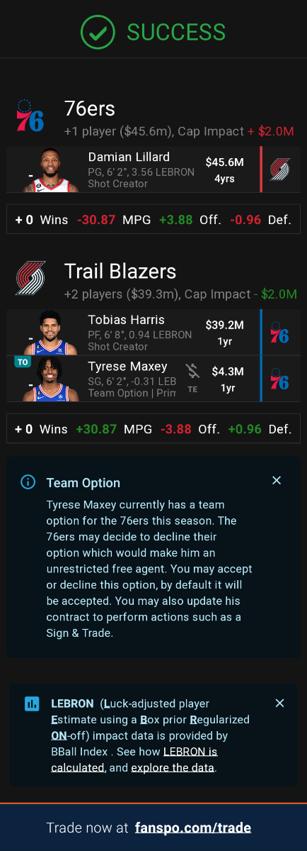 May 21, 20232 yr If Harden goes to Houston, do you still roll with Embiid and whoever you can get with the MLE to fill out the roster for another go under a new HC, or do you sell high on Embiid and commit to a rebuild with young players? I've seen mock trade proposals with the Trail Blazers for their #3 overall pick, Anfernee Simons, Shaedon Sharpe, and Jusuf Nurkic, in exchange for Joel Embiid. That's not a bad haul since you're guaranteed either Scoot Henderson or Braxton Miller in a draft class that has 3 elite prospects and a big drop off afterwards, with 2024 not projected to be a strong draft class in comparison. One caveat to the 2024 draft is that Bronny James will probably declare after 1 year at USC and whoever drafts him would benefit not so much from getting Bronny but landing LeBron (assuming he's a man of his word based on previous comments made about wanting to play with his son for a year). For what it's worth, the Sixers still have their 2024 draft picks.