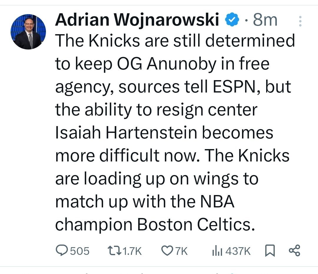 June 26, 20241 yr Just now, HazletonEagle said: Knicks cant let OG go after they gave what they gave to get him AND gave this package for Bridges. You look at the cumulative cost of both trades just to end up with Bridges and it looks really, really bad. My mind instantly went to- OG must be out. But it really wouldnt make sense. Theyre going to have OG and Bridges. Trade Randall. Will they then have enough to keep Hartenstein too? Brunson will require a super max in 2025 and Bridges likely one in 2026. Can the Knicks really fit a OG max contract in this offseason knowing those two guys will need max contract soon?