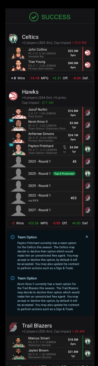 June 10, 20232 yr 36 minutes ago, DaEagles4Life said: They can get Siakam with 3 and Simons. Sixers wish If I’m Portland i want something better than siakam for 3 and Simons. I wonder if they can convince Boston to do a 3 way deal with the hawks. Id ask the hawks if they would blow it up for the right offer and amount of draft picks and someone taking on contracts like Collins. Don’t think it’s realistic but the amount of picks the hawks get is nice. Granted they are likely losing some nice picks doing so do to the murray trade. Might try and then deal murray to recoup more picks. Something like this