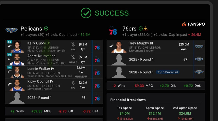 June 10Jun 10 Im not in love with trading with the Pelicans. Moving down to 7 feels to far.If you do it, you HAVE to be getting Trey Murphy or else theres no redeeming quality about that trade at all.You might even want to have a PG for Zion bad contract swap just to put some perceived upside in there to sweeten the deal, even if the upside is never realized.At 7, who are we drafting? I guess my preference would be for Maluach there.I kinda like a trade to 5 with the Jazz better for Lauri, and draft Kon. The shooting with Maxey, McCain, Kon, and Lauri would be superb.