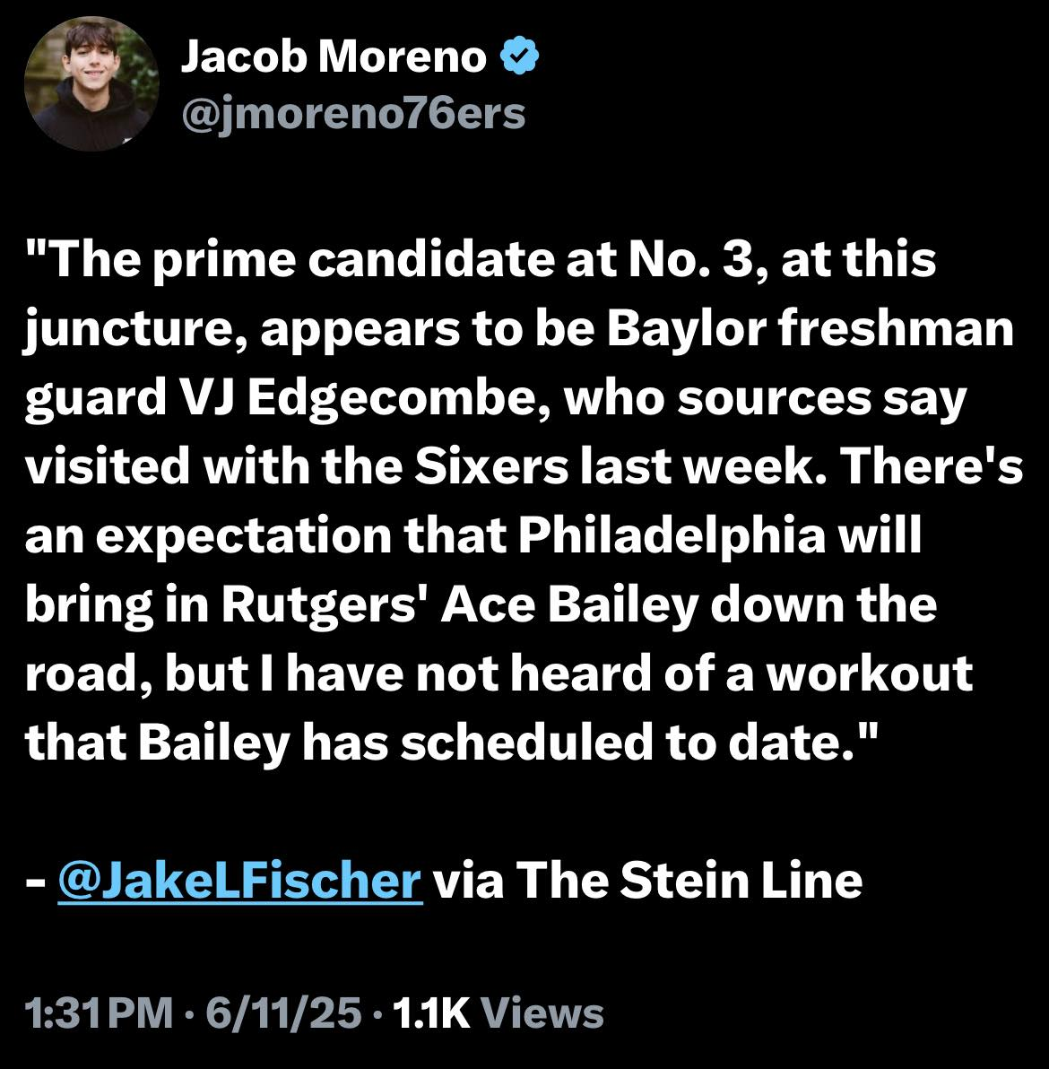 June 11Jun 11 Not going to lie feels like the VJ stuff being out out there was done for a reason. I don’t think they’d leak this out unintentionally which makes me feel Like it may be a misdirection or increase value of 3rd pick. Maybe if they show they love VJ that much then they want that much more value for 3rd pick and that a team like pelicans who love Bailey knows the hornets would take him at 4 they’ll have to give up more to make the Sixers move off it. Also