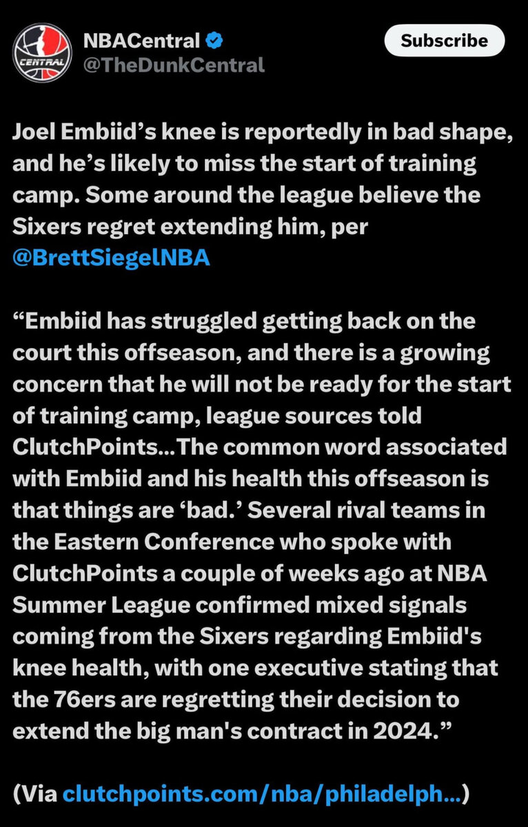 August 5Aug 5 With all the negative stories out there, indicating the whole league knows about Embiid's "bad" knees, I am surprised the Sixers are not moving forward with the signing of Quentin Grimes.That would be a positive news story. C'mon Morey. Get it done.On the Embiid issue, Sixers should start negotiating a retirement settlement.Sixers should offer to pay just the first year, not the remaining two.