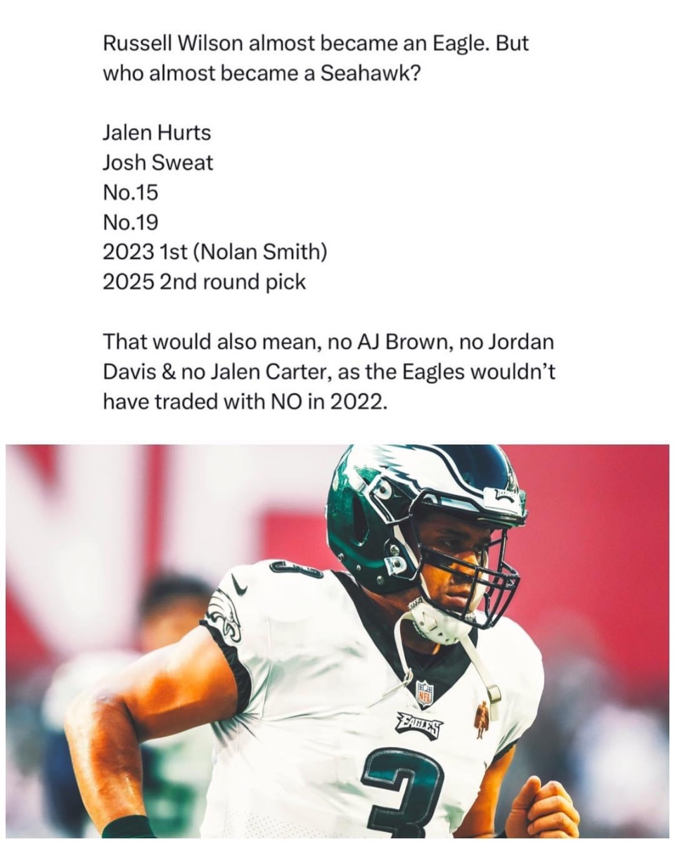 June 6, 20232 yr 19 hours ago, EazyEaglez said: When people were saying they wanted this trade back then around here, I kept saying that the Eagles weren’t just a quarterback away from being good. Them not making this trade is what made them the deeply talented team that they were. It was reported back then "even by Eskin who works for the Eagles” that they were in on Wilson. The shocking part was this year and the new information makes it seem like the deal was all but done. It would have been a huge mistake by Howie if this trade happened. Saw this posted elsewhere. Perhaps it would vary slightly from what is outlined but the point is the same ... everyone with half a brain cell knew what it would cost to hitch our wagon to a QB obviously past his prime and the biggest reason why I was so against making the transaction when it was rumored we were interested.
