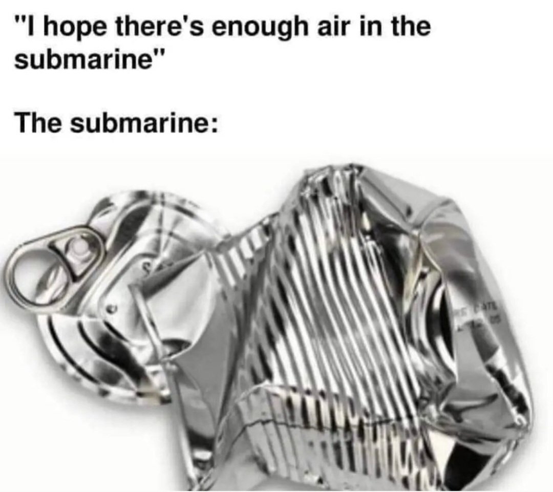 June 29, 20232 yr 7 minutes ago, Toastrel said: Probably a human tomato paste with bone fragments. The pressure wouldn't leave much. I read that the air, when compressed in the explosion, would also cook things pretty thoroughly. Explanation of the implosion Hate TikTok but this is a good explanation (link is to reddit). Provided the sub imploded at this depth, basically the amount of pressure would cause it to heat to the temp of the surface of the sun.
