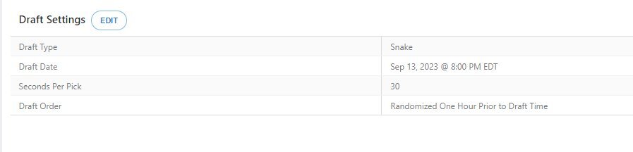 September 13, 20232 yr I sent out invitations to get the last two members, @Agent23 hasn't signed up yet so the next two who except the invitations are in. I moved the draft to next Wednesday 9/20.