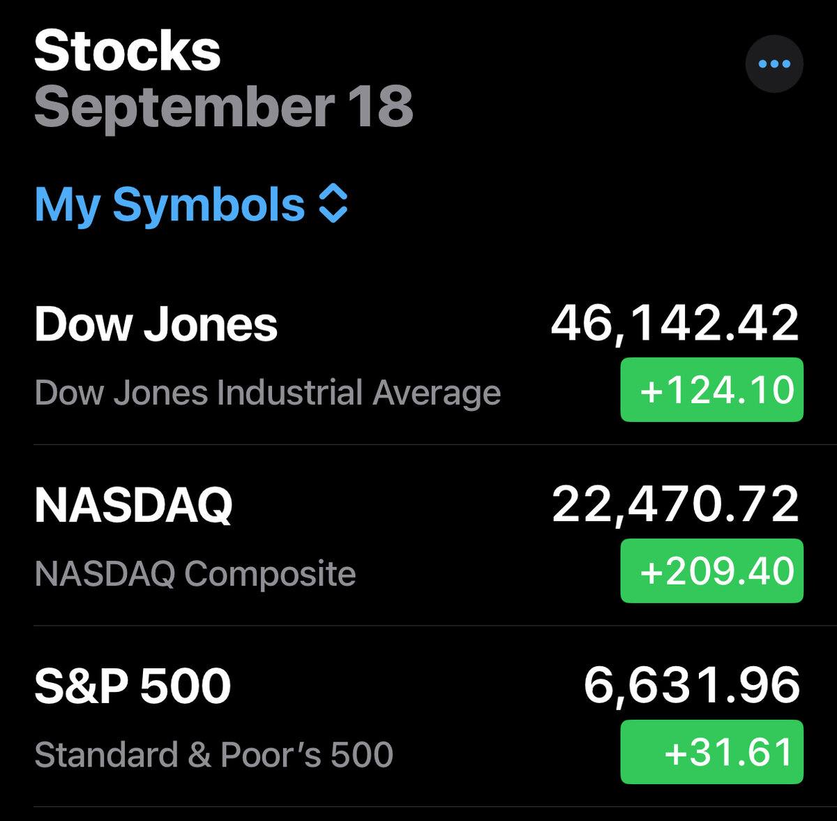 September 18, 2025Sep 18 14 minutes ago, It Hurts said:All 3 records. Thought it was suppose to crash like 3 months ago. HmmmmThe "crash” did happen about 4 months ago because of the stupid tariffs so you’re just bit off. Recent markets are just reacting to the rate cut.