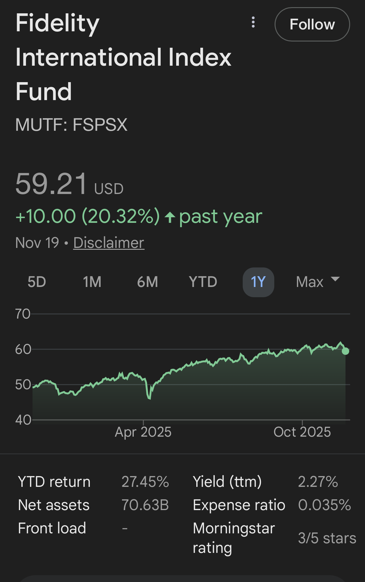 November 20, 2025Nov 20 5 hours ago, xzmattzx said:What do you recommend?I am not a financial planner, so talk to yours. But, any international funds is a good bet. Obviously don’t put everything in them, but here is one over the past year: